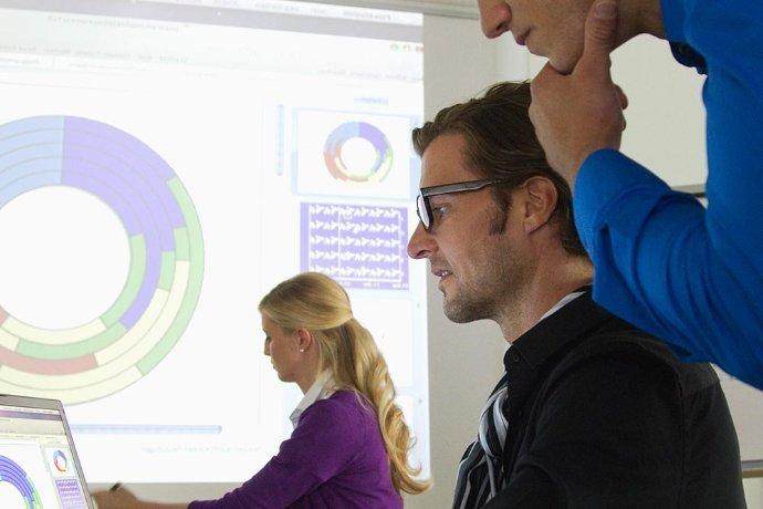 Zet vergaderingen om in levendige discussies met twee interactieve pennen voor aantekeningen op het scherm of finger-touch bediening¹⁶ op het hele scherm, plus projectie op elk vlak oppervlak dat u zich kunt voorstellen, waaronder een tafelblad. Bespreek en ontwikkel ideeën en sla het resultaat op of druk het af, of e-mail documenten rechtstreeks naar MS Outlook-contactpersonen dankzij LDAP-ondersteuning (Lightweight Directory Access Protocol).